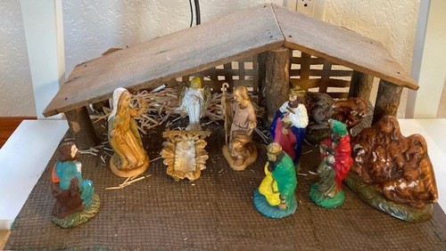 When John and I married, one of our wedding presents was a plastic nativity set: Joseph, Mary, and Baby Jesus, plus his manger. Later that year John’s parents sold their home, and they passed along some hand painted plaster figures: an angel, one shepherd and the three wisemen, as well as a very large, glazed donkey and a camel the size of the three wisemen. John built a ranch style creche for our diverse little group and cut some wisps of straw from a hula skirt his father had brought home from Guam. We allowed our kids to play with the manger scene, and I remember touching up the paint on the plaster figures and noticing that the camel developed white patches as Christmases came and went.
